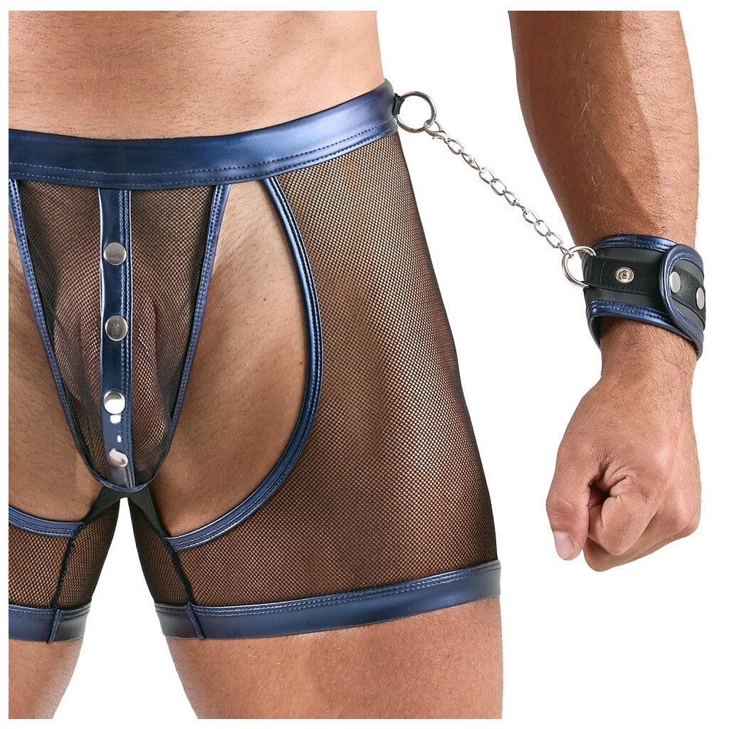 Tight-fitting short top, accentuating pants, and 2 handcuffs in a set from Svenjoyment Bondage. Black-transparent, elastic, soft mesh edged in an elegant blue metallic wet look. Striking accents of silver-colored studs and rings. Top and pants with revealing cutouts at the front. The pants are also open at the back. The two included handcuffs can be quickly attached to the top and pants with their carabiner chains. The soft cuffs in blue metallic wet look are easy to put on and adjust for sensual restraint thanks to Velcro fasteners.