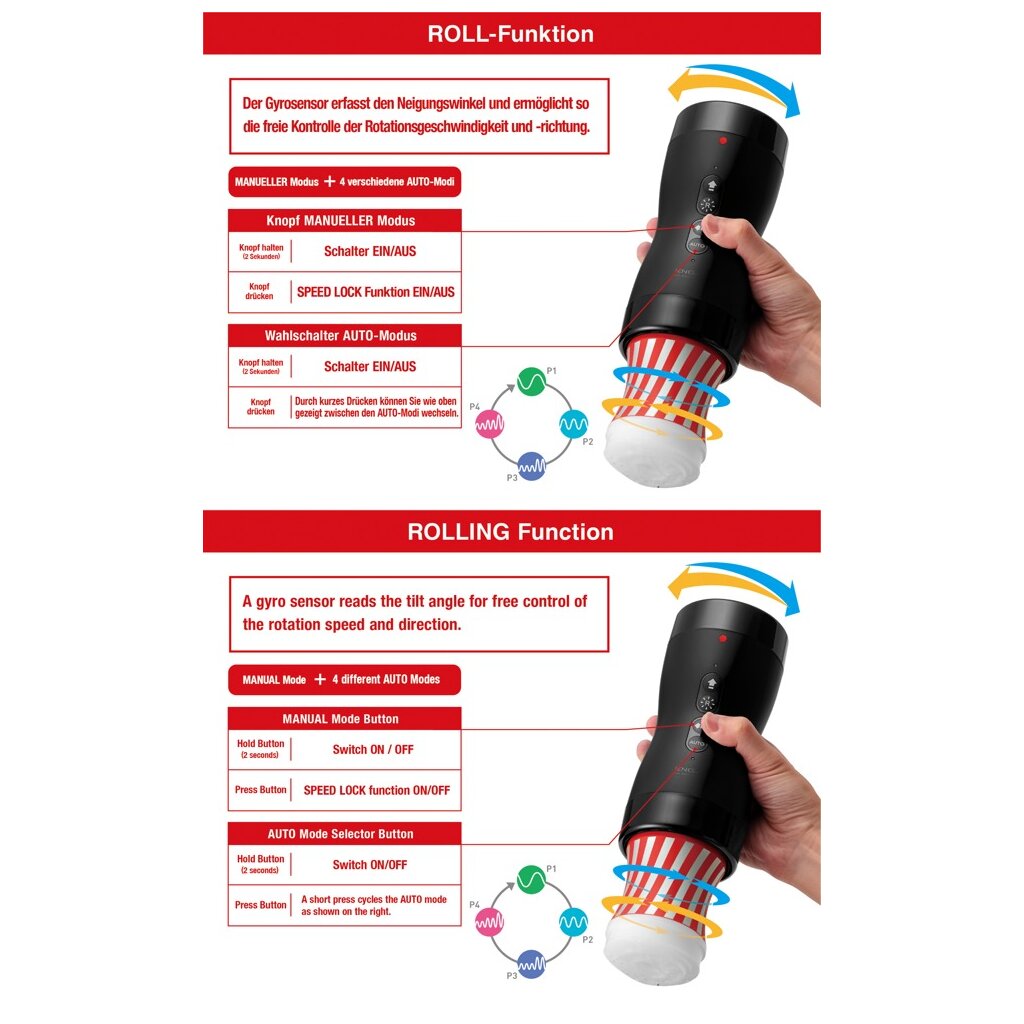 The rechargeable masturbator attachment Vacuum Gyro Roller by Tenga is perfectly compatible with the Rolling Cup and Original/Premium Vacuum Cup by Tenga. The enclosed Rolling Tenga Cup Regular is simply inserted into the Vacuum Gyro Roller to enjoy an intensely rotating handjob massage with suction effect fully automatically. Thereby 4 rotation modes in both directions as well as 6 exciting suction modes can be intuitively controlled comfortably at the push of a button directly on the Vacuum Gyro Roller. USB charging cable included.