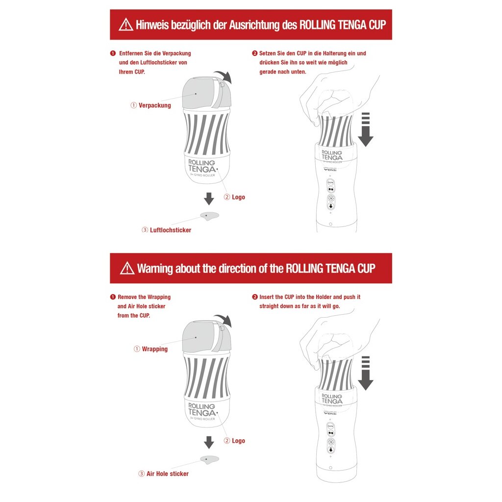 Of course, the included Rolling Tenga Cup can also be used without the Vacuum Gyro Roller for a handjob. The disposable masturbator is ready for immediate use. After the soft entry, the penis is provided with plenty of lubricant by the lubricant ring, so additional lubricant is not necessary. For the suction effect, the sticker is removed from the vacuum opening at the end of the cup and this is closed or opened with the finger (as desired).