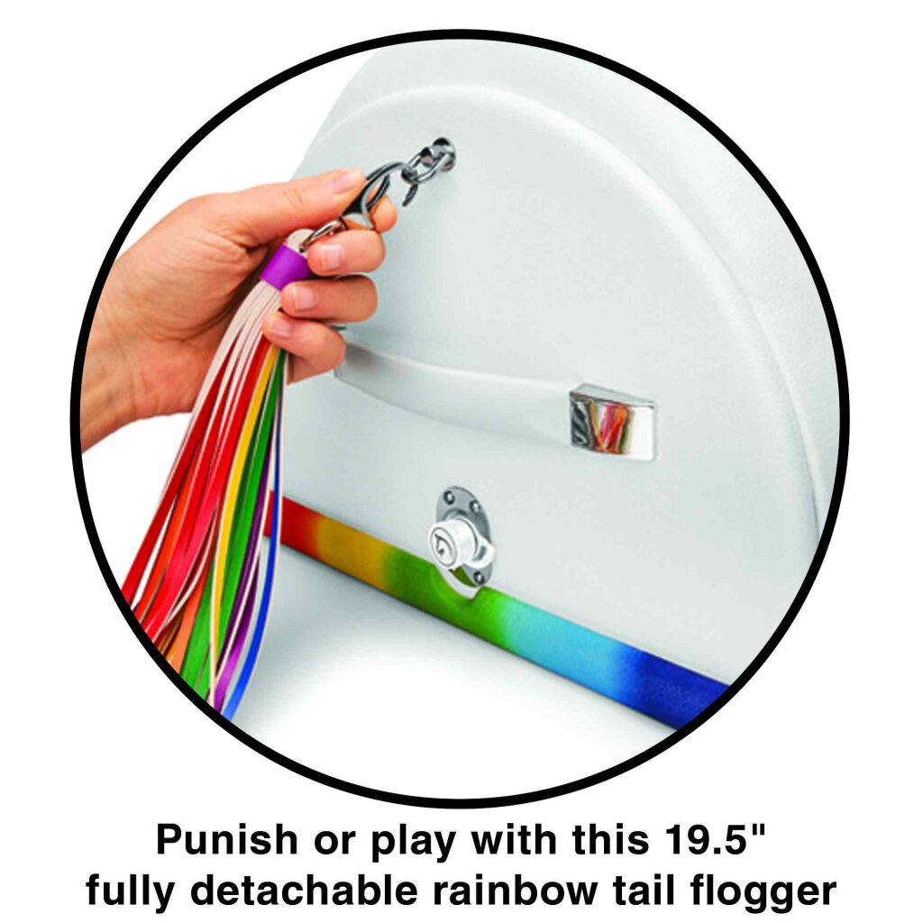 attachments, saddle up for your next ride into euphoria with penetrative and non-penetrative stimulation. Crank up the power with a corded LED remote and bring some color to your playtime with a detachable rainbow tail flogger. Plus, with 400lbs of weight capacity, the Unicorn is your perfect adventure partner for solo or partner rides.