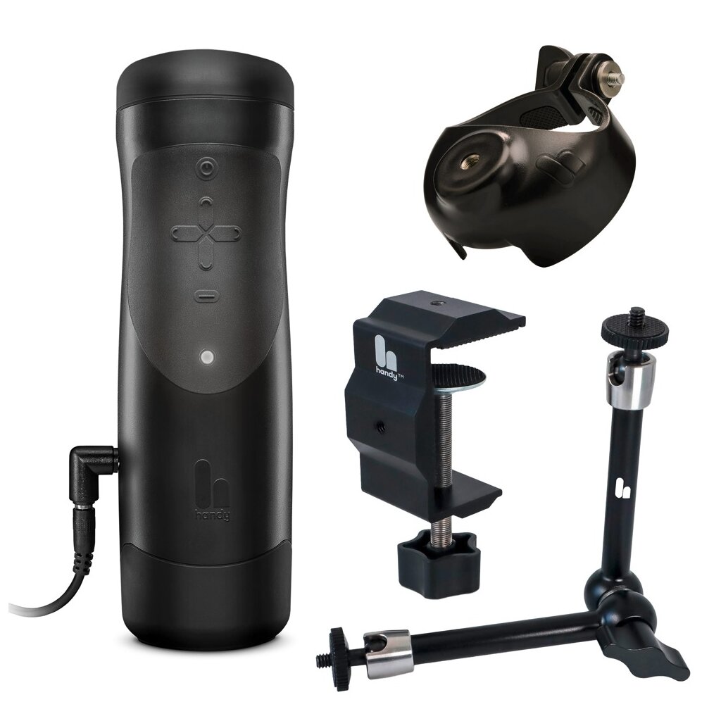 The set includes The Handy Interactive Stroker Masturbator, the HandsFree Desk Mount, the HandsFree Cup, as well as the complete accessory package with TrueGrip Sleeve and TrueGrip Band.