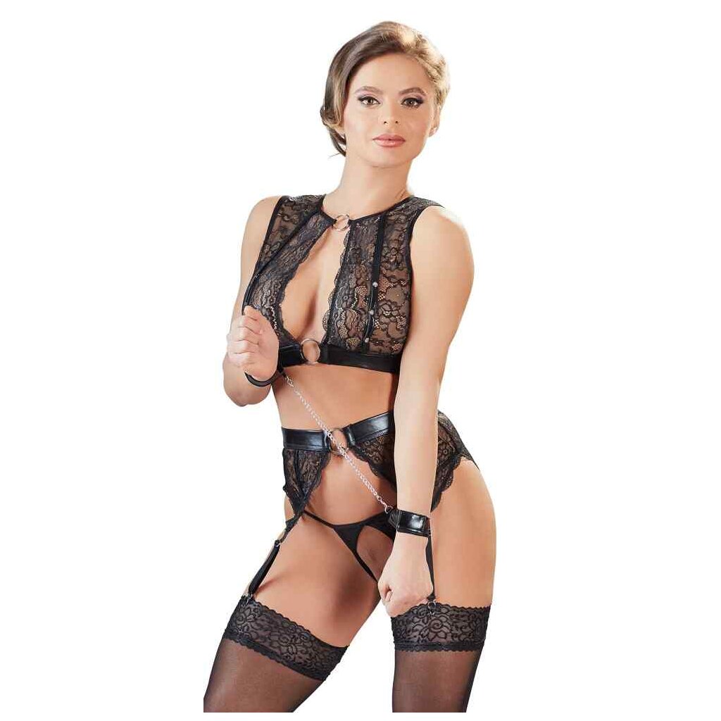 3-teiliges Wäsche-Set inklusive Handfesseln! Top, Strapsgürtel und String ouvert im Mix aus transparenter Spitze und schwarzem Wetlook. Der Clou sind die schnell zu öffnenden Druckknöpfe über dem Busen und die Handfesseln mit Klettverschluss, die dank Karabinern an den Zierringen von Top und Strapsgürtel schnell ein- und ausgehakt werden können. So wird aus dem Wäsche-Set schnell ein besonderes Bondage-Set für Einsteiger!