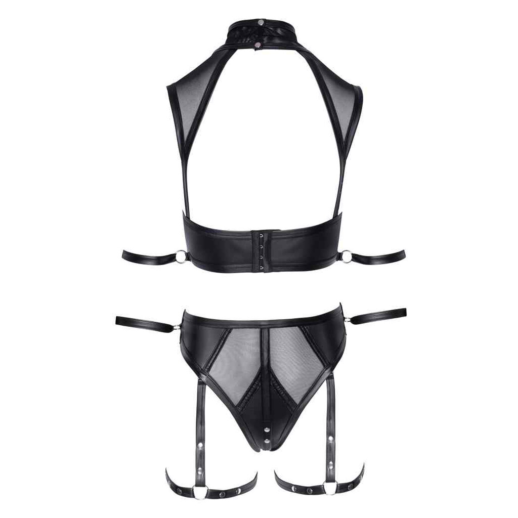 Top et slip de Cottelli BONDAGE en belle matière d'aspect mat avec des inserts transparents en powernet. Haut très décolleté avec un col haut qui a un anneau décoratif à l'avant et 2 boutons pression à l'arrière pour le fermer. Il est presque sans dos mais il y a une large bande de tissu avec une fermeture à crochet. Il y a un anneau de chaque côté avec des attaches pour les bras. La culotte est haute comme la taille et comporte des boutons-pression au niveau de l'entrejambe pour des moments de plaisir érotique. Il y a un anneau de chaque côté (dans la zone de la taille) avec des attaches pour les mains. Les sangles de cuisses peuvent être enlevées. Les entraves pour les bras et les mains ont des fermetures à crochets et à boucles et peuvent également être retirées.