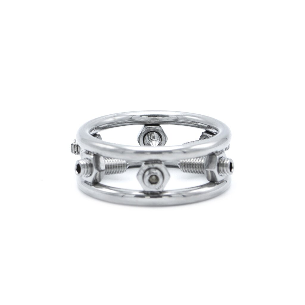 À l'intérieur de l'anneau se trouvent 6 pointes, il suffit de tourner les pointes vers l'extérieur en les tournant dans le sens inverse des aiguilles d'une montre avec la clé hexagonale incluse, de le placer sur la tête de votre pénis et de commencer à tourner les pointes dans le sens des aiguilles d'une montre pour obtenir un niveau de douleur qui vous convient !