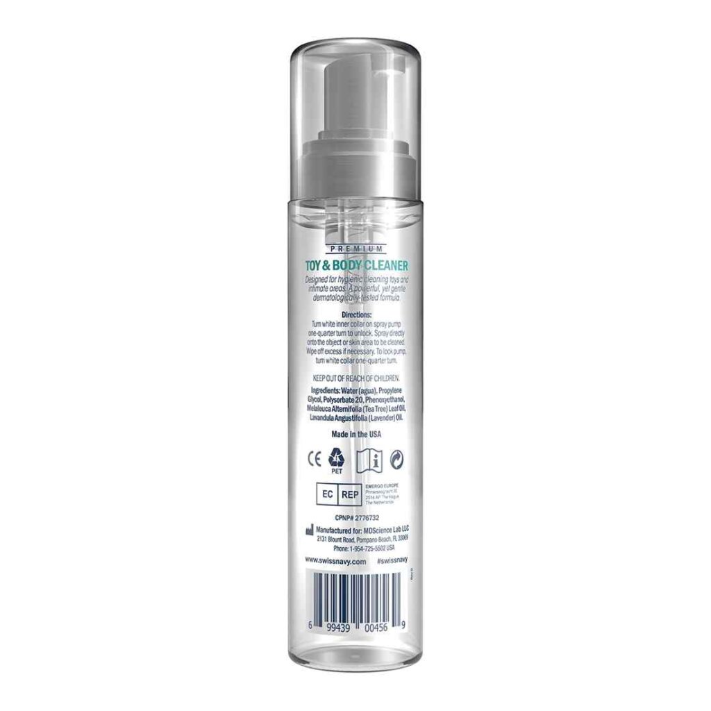 Without proper cleaning, a toy may become a breeding ground for things you dont want. After toy play, spray the toy with a complete coating of the cleaner. Wipe the toy with a clean cloth and rinse the toy with water. Air-dry the toy for the next use. Swiss Navy Toy Body Cleaner excels at cleaning toys when silicone lubricants have been applied. Leave your toys clean and your skin feeling great!