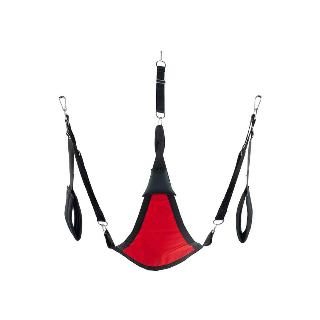 This red Fabric swing is designed in a triangular shape. It fits with 3 or 4 attachment points. The swing comes with the accessories: 4 hangers with metal carabiners, padded footrests (11cm wide) and a black triangle cushion (24 x 20cm).