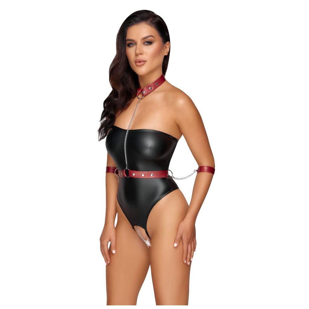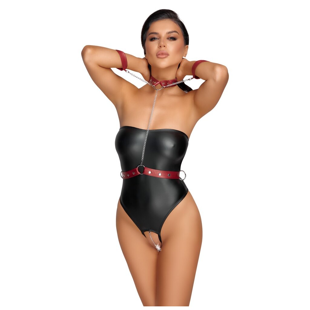 Schulterfreier Stringbody ouvert von Cottelli BONDAGE im edlen schwarzen Mattlook. Dazu ein abnehmbarer Harness im roten Mattlook mit silberfarbenen Metall-Accessoires. Die Karabiner-Ketten sind vom Harness abnehmbar, sodass Halsband, Tailllengurt und Handfesseln auch solo getragen werden können. Das Halsband und der Taillengurt sind mit Druckknöpfen, die Handfesseln mit Klettverschlüssen passend verstellbar. Durch den komplett offenen Schritt führt eine stimulierende Kette, die auch abgenommen werden kann.