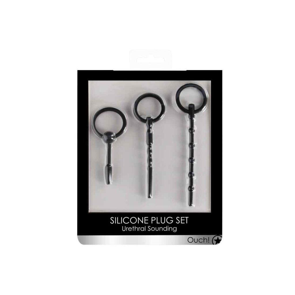The OUCH! Urethral sounding Plug Set is comprised of 3 phthalate-free high-grade smooth medical silicone dilators, which can be used incrementally for urethral play. They can be used to create immense stimulation and to gradually open up new realms of pleasure. These flexible, textured dilators can produce incredible sensations and help build up strong erections and powerful orgasms. They are ideal for BDSM play and especially for creating medical play experiences. Each of the dilators has a different size and texture for added sensation and a gentle transition from one size to the next. See specifications for exact sizes on the box. The ring pull design offers the security of easy removal. Warning: If not conducted carefully, sounding carries a risk of irritation, tearing of the urethra, or of urinary tract infection.