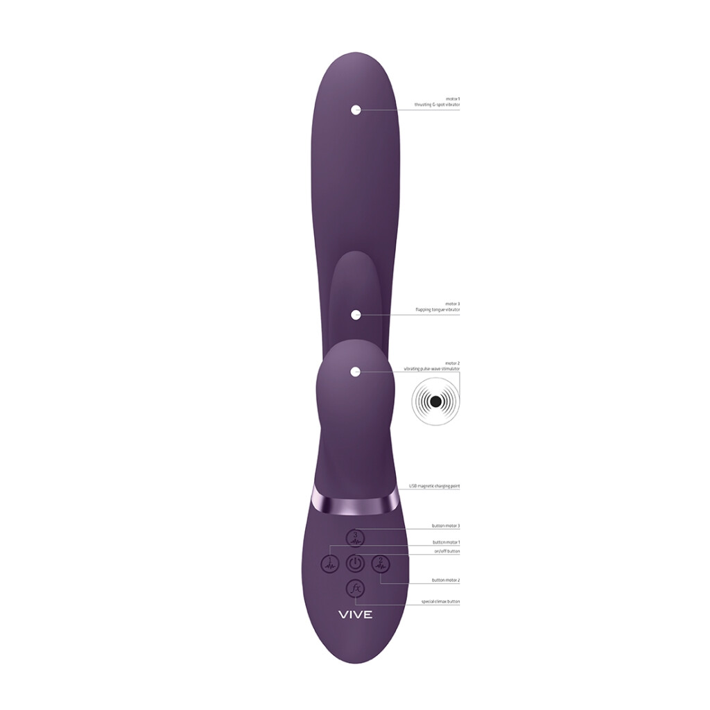 VIVE052 ist eine Klasse für sich. Mit drei F1-Motoren der neuen Generation mit 10 Funktionen und seinen fortschrittlichen Technologien (drei Motoren können unabhängig voneinander gesteuert werden): ein innovativer NG F1-Schubmotor mit 10 Funktionen für den G-Punkt, ein NG F1-Motor mit 10 Funktionen und ein NG F1-Motor mit 10 Funktionen und Pulswellen für die Stimulation der Klitoris, wird er Sie in all Ihren erogenen Zonen zu einem Höchstmaß an Vergnügen führen. Sie können Ihr Toy mit bis zu 1.000 verschiedenen Einstellungen versehen. Er besteht zu 100 % aus seidenweichem, medizinischem Silikon (hypoallergen), ist absolut wasserdicht (IPX7) und mit unter 60 dB extrem leise. Das bedeutet, dass Sie ihn überall dort verwenden können, wo Ihr Herz begehrt! Er enthält einen magnetischen, über USB aufladbaren Lithium-Ionen-Akku. Wenn er über das USB-Kabel vollständig aufgeladen ist, bietet er 60 Minuten leidenschaftliche Spielzeit. Einfach einstecken, aufladen und spielen! Wenn du kurz vor dem Höhepunkt stehst, genügt ein Druck auf die spezielle Climax-Taste, um alle Motoren auf volle Leistung/Geschwindigkeit zu bringen und, was noch wichtiger ist, um dich zu einem weltbewegenden Orgasmus zu bringen