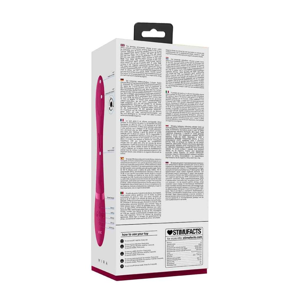 Der kreisende, wiederaufladbare G-Punkt Rabbit Vibrator (Mira) verfügt über kreisende Perlen mit 10 Funktionen im Stimulator der G-Punkt-Spitze, sowie 10 Funktionen an der Spitze des G-Punkt-Vibrators und 10 Funktionen, die dem Klitoris Vibrator gewidmet sind. Mira wird Ihre tiefsten Wünsche erfüllen. Mit den 3 neuen Generation Motoren können Sie über 1.000 verschiedene Einstellungen vornehmen. Aus 100 % seidigem, geschmeidigem Silikon und in medizinischer Qualität hergestellt. 100 % wasserdicht (ipx7) und extrem leise bei unter 60 dB - was bedeutet, Sie können es tun, wo immer es Ihr Herz begehrt. Er enthält einen wiederaufladbaren Lithium-Ionen-Akku, der mit einem magnetischen USB Kabel aufgeladen wird und voll geladen für 50 Minuten leidenschaftlichen Vergnügens sorgt. Einfach klicken und aufladen! Wenn Sie sich dem Höhepunkt nähern, verwenden Sie die Funktionstaste für den speziellen Höhepunkt. Ein Knopfdruck auf die Funktionstaste und alle Motoren gehen sofort auf volle Leistung/Geschwindigkeit und das noch Wichtigere ist, Sie bringen sich selbst zu einem welterschütternden Orgasmus.