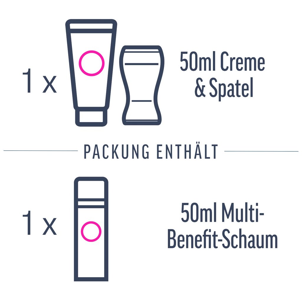 With the Veet EXPERT Intimate Hair Removal Set, you can effectively and quickly remove unwanted body hair from the entire outer intimate area. The set contains EXPERT Intimate Hair Removal Cream, which has been specially developed for the sensitive skin in the outer intimate area and removes even thicker hair in just 2 minutes. The formula with shea butter moisturizes the skin for up to 48 hours. The EXPERT Multi-Benefit Foam provides optimal pre- and post-treatment. The gentle, creamy foam with a mild exfoliating effect and soothing properties completes the hair removal routine.