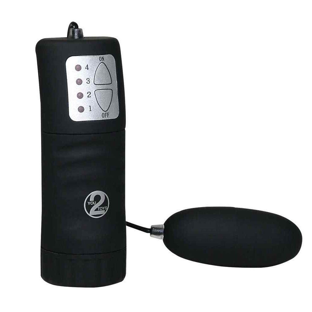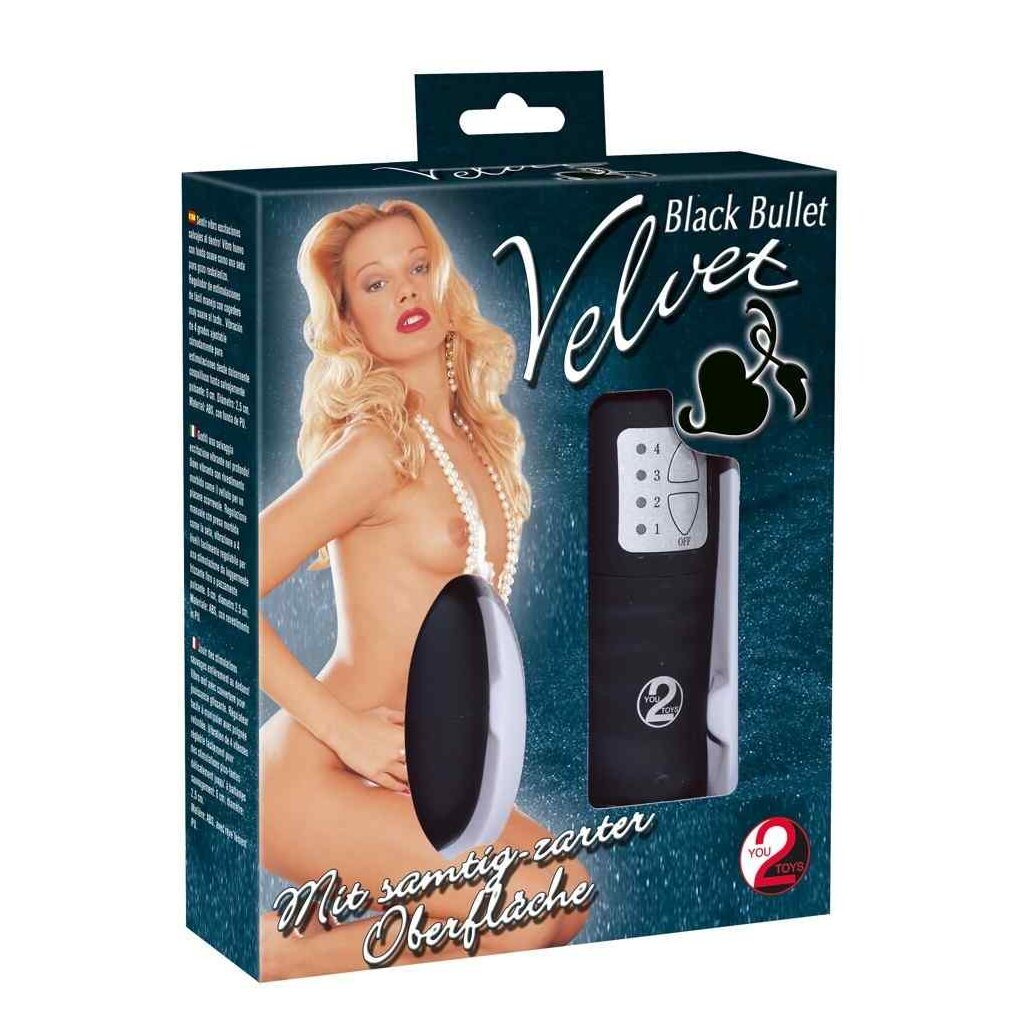 Black vibro bullet made of solid easy-glide material with a velvety surface. With a push-button control for easy control of 4 level vibrations. Length 6 cm, Ø 2.5 cm.