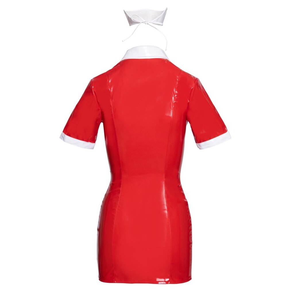 Short dress from Black Level including hood. Half sleeve dress in red patent shine with white contrast details and black cross emblem. In tight cut with full-length zipper in front. The white patent hood to tie also has a cross emblem in front.