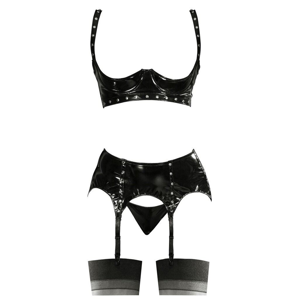3-piece set by Black Level consisting of lightly lined underwire lift, suspender belt and thong. Everything completely in black patent shine with decorative rivet ornamentation. Underwire lift and suspender belt at the back each with hook closure. The straps and 6 garter straps are adjustable in length for perfect fit.