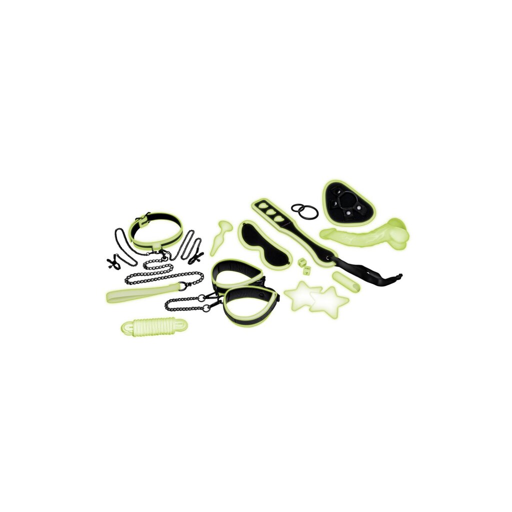 This bundle includes a stylish eye mask with a sleek glow-in-the-dark outline along with an array of beginner-friendly bondage accessories and other toys featuring an eye-catching glow-in-the-dark effect to make your sub visible when the lights are off.