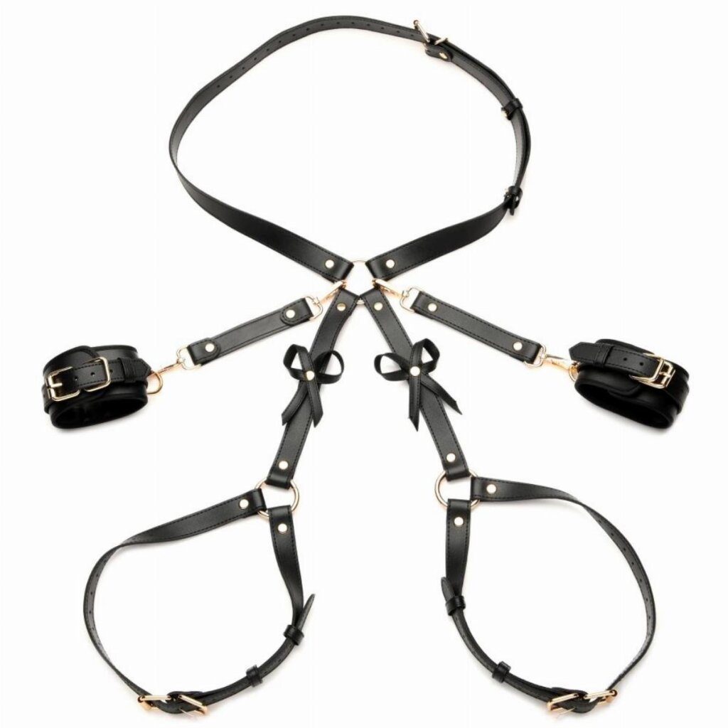If you're looking for a toy for your submission games, the Bondage Harness with Bows is an excellent choice. This beautiful harness is designed to hold your waist, thighs and wrists with straps and cuffs and features bows that accentuate the back of your thighs and highlight your curves.