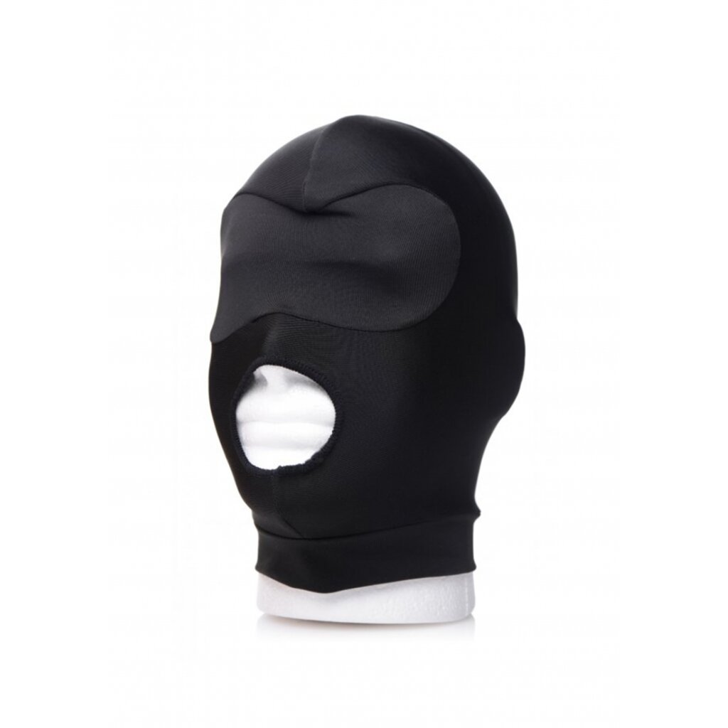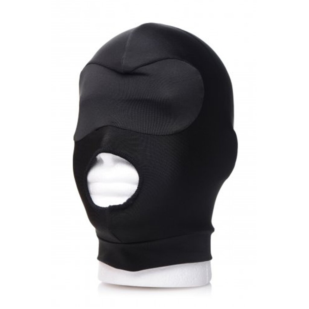 Deprive him of his vision, but leave that useful mouth accessible when you pull a stretchy black hood over his head.