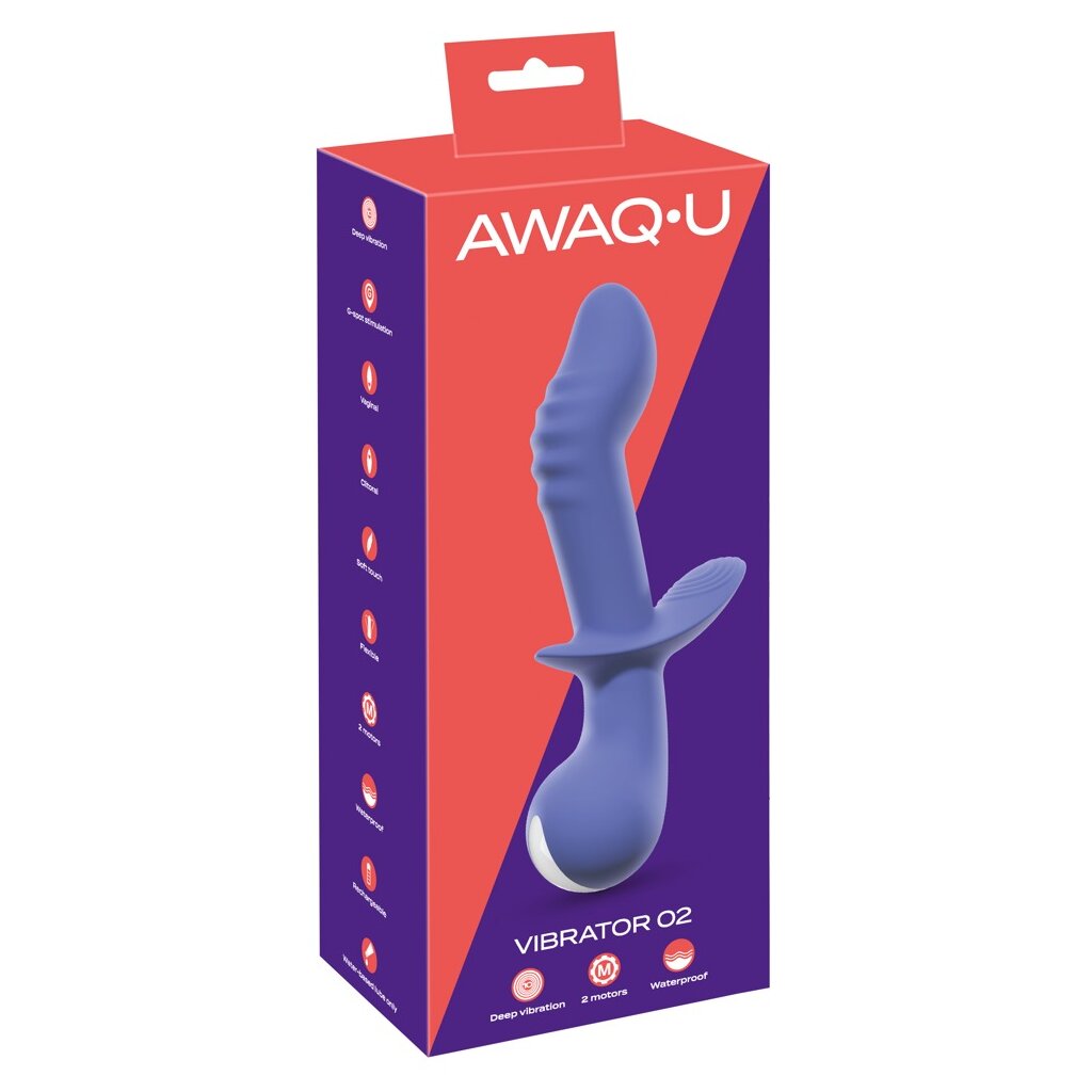 Stylischer Vibrator mit Klitorisstimulator AWAQ.U Vibrator 2 von You2Toys in Trendfarbe Lila. Gleich 2 leistungsstarke Motoren sorgen für jeweils 10 Vibrationsmodi im Schaft und im Klitorisstimulator. Die kraftvollen Vibrationen sind bequem per Knopfdruck direkt am Toy steuerbar: Die Vibration im Schaft mit dem On/Off-Button, die Vibrationen im Klitreizer mit den beiden +/- Buttons. Sogar im/unter Wasser, denn dieser Rundumverwöhner ist wasserdicht.