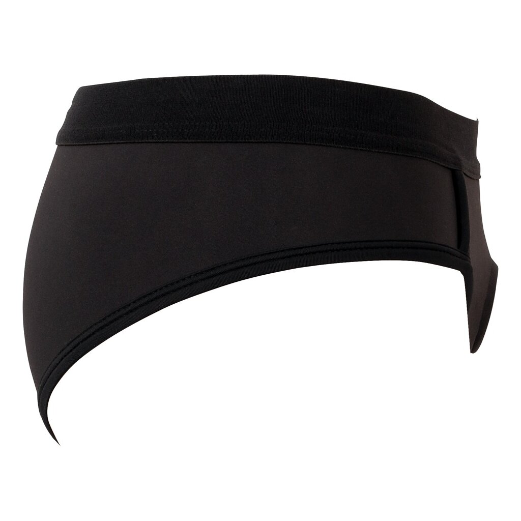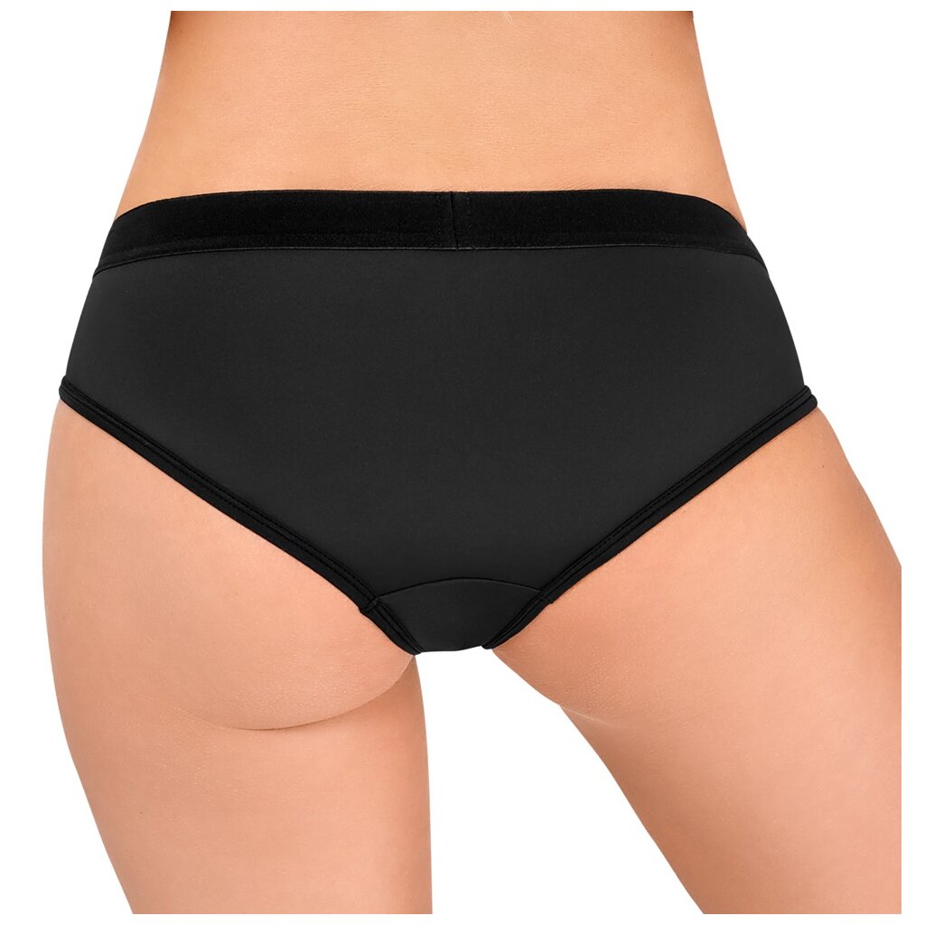 Schwarzer Strap-On-Slip von Bad Kitty aus weicher, dehnbarer Mikrofaser. Vorne doppellagig und mit einem Schlitz sowie einem sorgfältig eingearbeiteten Stretch-Haltering (Ø 3,5 cm) zum Einführen eines Dildos/Vibrators mit Stand-/Saugfuß.