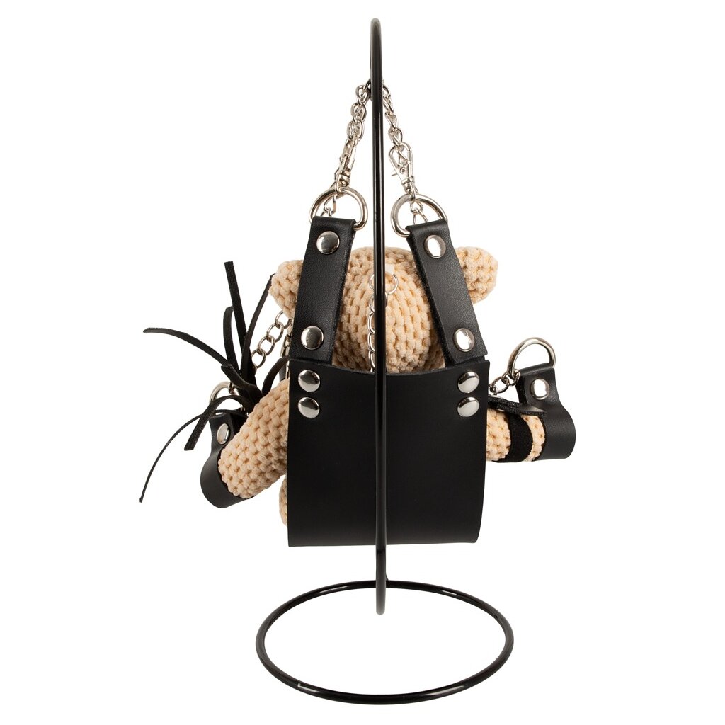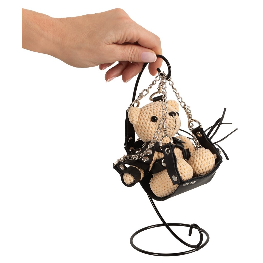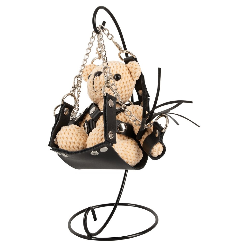 Zarter kleiner SM-Teddybär mit Schaukel von Bad Kitty. Teddybär im Häkel-Look und superweich im Griff. Gekleidet im typischen SM-Look mit Harness, Fesseln und Mini-Peitsche aus schwarzem Kunstleder. Schlüsselanhänger mit Kette und Ring am Kopf. Die kleine, stylische Schaukelmatte wird einfach in den Metallrahmen der Mini-Sexschaukel (Swing) eingehängt – und schon kann Teddy Platz nehmen ...