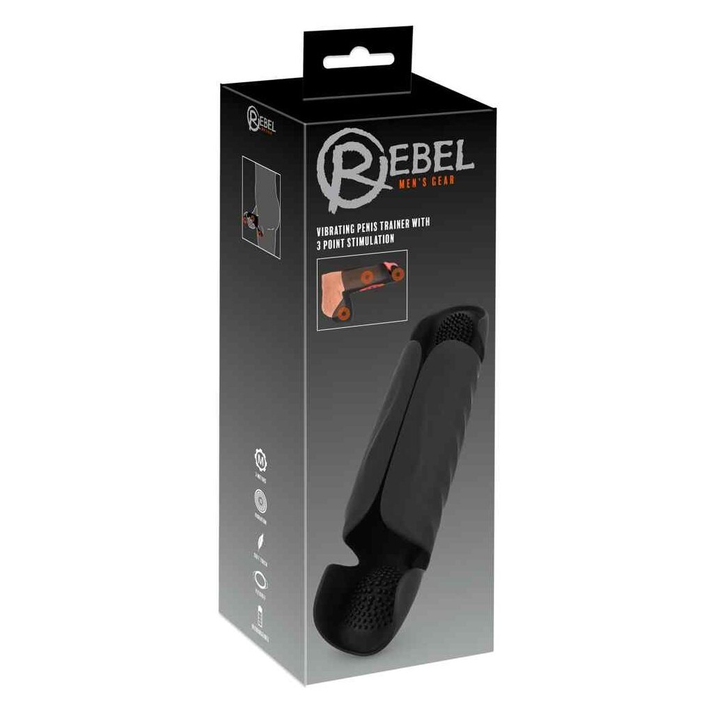 Handlicher Masturbator Penis Trainer with 3 Point Stimulation von Rebel mit flexiblen Flügeln, die den Penisschaft fest umschließen und Eichel sowie Hoden in flexiblen Segmenten sanft einbetten. So kann der Masturbator auch bei Erektionsstörungen verwendet werden. Im Eichel-Segment massieren und verwöhnen softe Noppen, im Mittel-Segment ausgeprägte Reizrillen und im Hoden-Segment festere Noppen. 3 Motoren in jedem Segment einer sorgen für grandiose Stimulation mit jeweils 10 Vibrationsmodi, die separat per Knopfdruck direkt am Toy bequem steuerbar sind. Das hochwertige Silikonmaterial sorgt beim Masturbieren für ein sehr angenehmes Hautgefühl. Wiederaufladbar inkl. USB-Ladekabel.