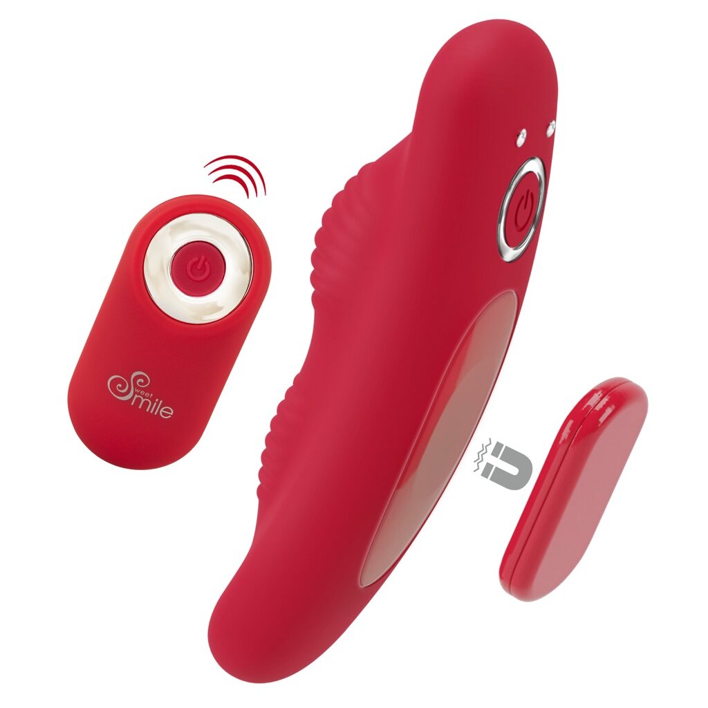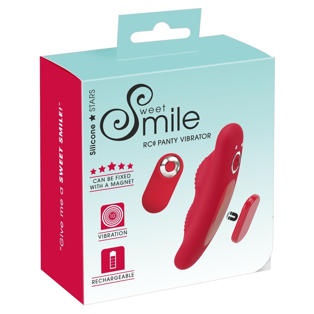 Federleichter, flüsterleiser RC Panty Vibrator von Sweet Smile mit kleinem starken Magnet zur rutschfesten Befestigung in jedem Slip. Stimuliert gezielt und intensiv Klitoris und Vulva – jederzeit und überall – völlig diskret, ohne dass jemand etwas bemerkt! 10 Vibrationsmodi sind mit der praktischen Fernbedienung bequem steuerbar. Bei einer Reichweite von 8 Metern auch vom Partner oder der Partnerin für Überraschungs- und Kontrollspiele. Die Vibrationen können auch direkt am Panty Vibrator per Knopfdruck gesteuert werden. So kann der RC Panty Vibrator auch als Auflegevibrator verwendet werden. Der seidig softe Panty Vibrator aus Silikon ist ideal geformt. Er passt sich mit seinen beiden reizstrukturierten Erhebungen perfekt der Anatomie an. So sind die Vibrationen bei jeder Körperbewegung stets intensiv spürbar. Wiederaufladbar – inklusive USB-Ladekabel und Batterie (CR2032) für die Fernbedienung. Panty Vibrator mit 10 Vibrationsmodi / Gesamtlänge: 9,7 cm / Breite: 3 cm / Höhe: 2,7 cm / Materialien: Silikon, PU, ABS
