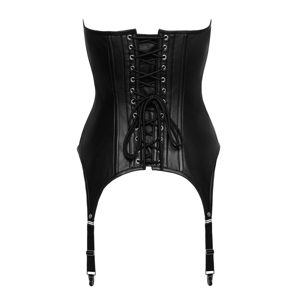 Strapless, unlined suspender corsage by ZADO made from soft lambskin leather with silver-colored metal details. Incorporated flexible shaping straps and underlaid, variable lacing at the back for a beautifully tailored silhouette. Full-length zipper at the front for easy dressing and undressing. The suspender straps are adjustable.