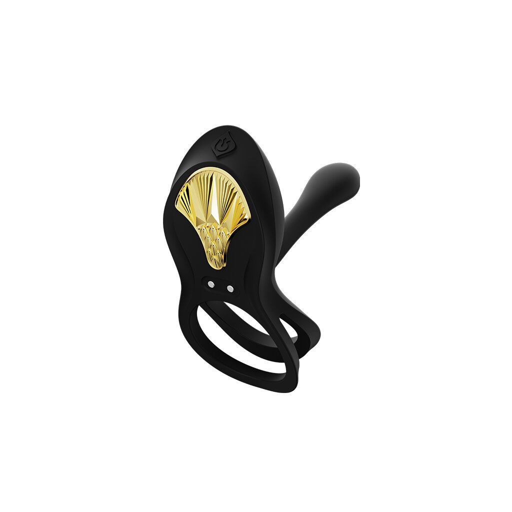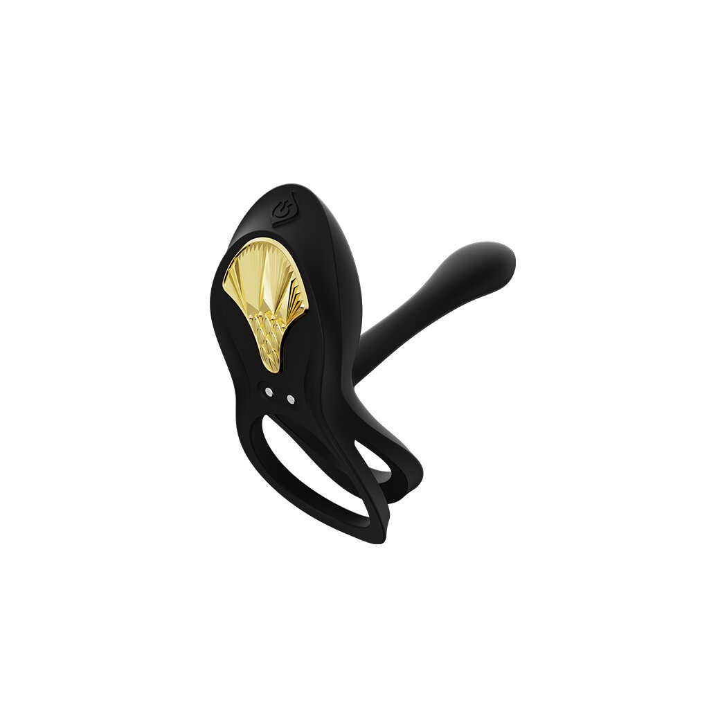 BAYEK is designed to elevate couples’ sexual experiences to epic proportions that are worthy of the gods of ancient Egypt. Sleek, soft silicone covers this ergonomic shape that comfortably fits between two bodies to enhance penetration from the inside and out. Featuring 8 powerful modes of vibration to stimulate the clit as well as the G-Spot, BAYEK features a built-in motor in its extending arm that comfortably fits over the shaft to provide deep internal massage. BAYEK also features dual rings that stretch around the scrotum and base of the penis to enhance erection. It can also be worn around the fingers to enhance stimulation by hand. A beautiful, gleaming golden shield-shaped embellishment adorns the exterior of the device for a boost of style.
