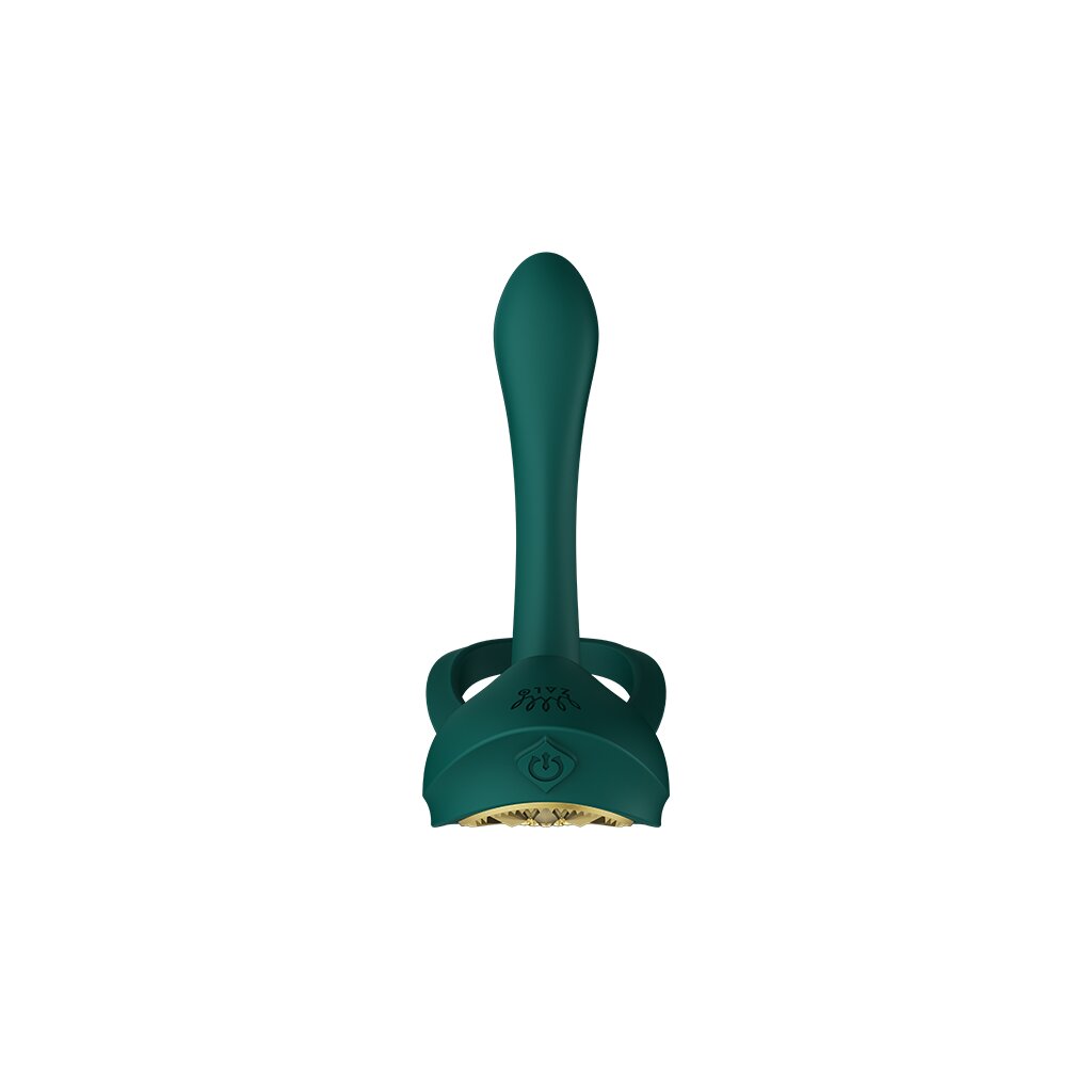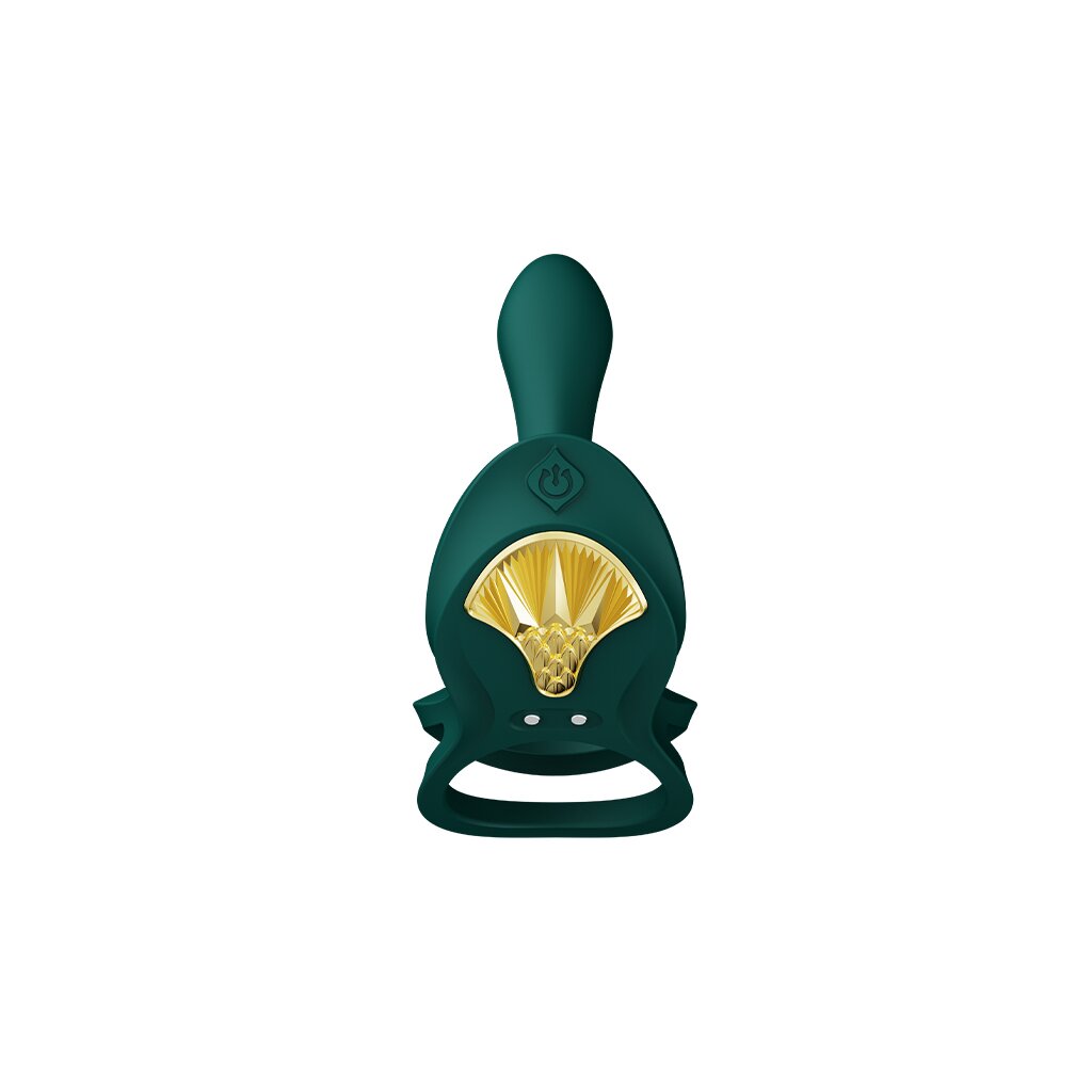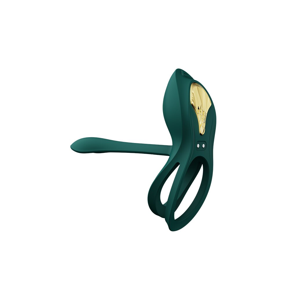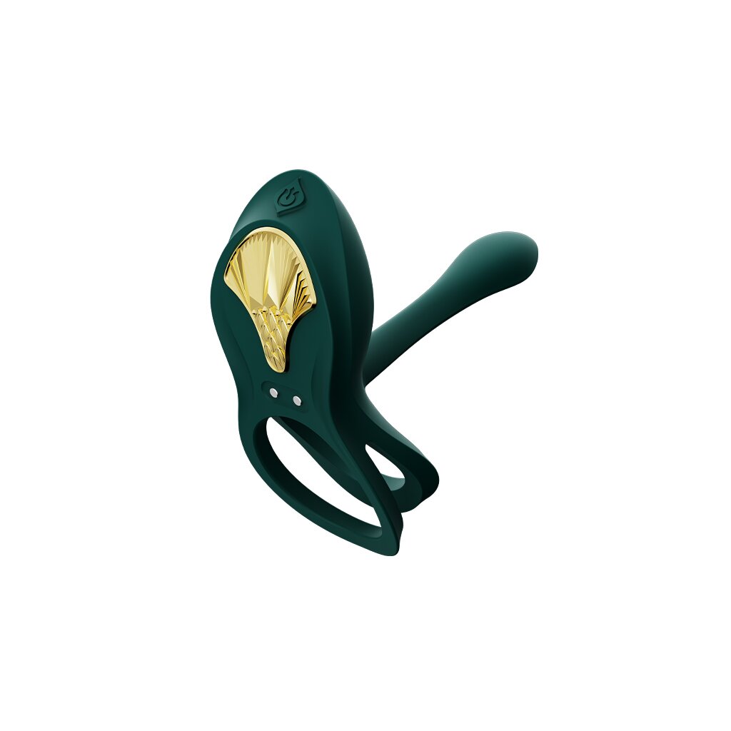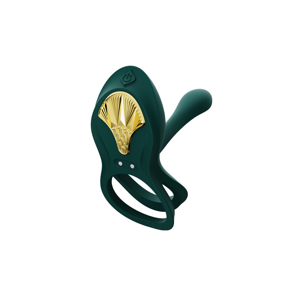 BAYEK is designed to elevate couples’ sexual experiences to epic proportions that are worthy of the gods of ancient Egypt. Sleek, soft silicone covers this ergonomic shape that comfortably fits between two bodies to enhance penetration from the inside and out. Featuring 8 powerful modes of vibration to stimulate the clit as well as the G-Spot, BAYEK features a built-in motor in its extending arm that comfortably fits over the shaft to provide deep internal massage. BAYEK also features dual rings that stretch around the scrotum and base of the penis to enhance erection. It can also be worn around the fingers to enhance stimulation by hand. A beautiful, gleaming golden shield-shaped embellishment adorns the exterior of the device for a boost of style.