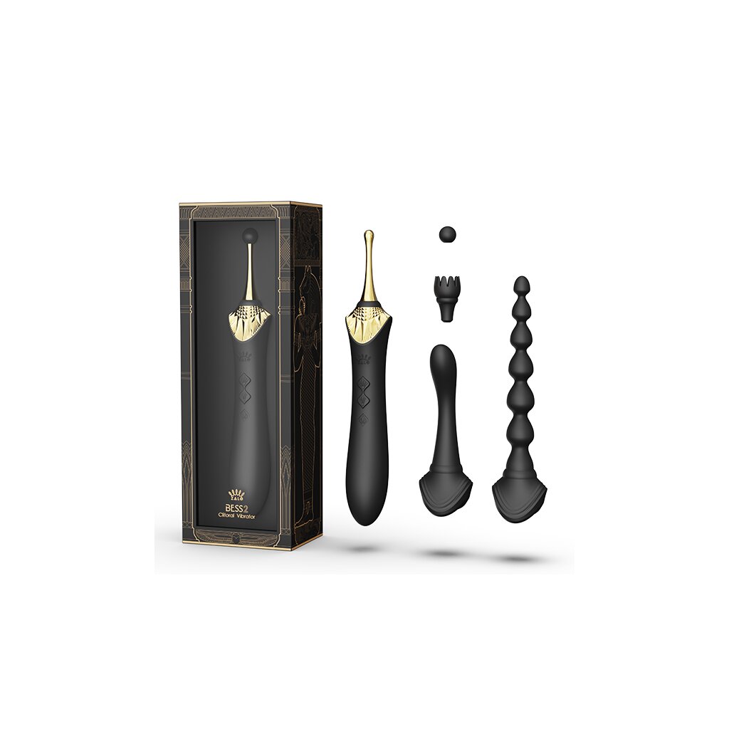 Included in delivery: Bess, 1 bullet-shaped attachment, 1 flower-shaped attachment, 1 G-spot attachment, 1 anal bead attachment, USB charging cable, satin storage pouch, instruction manual.